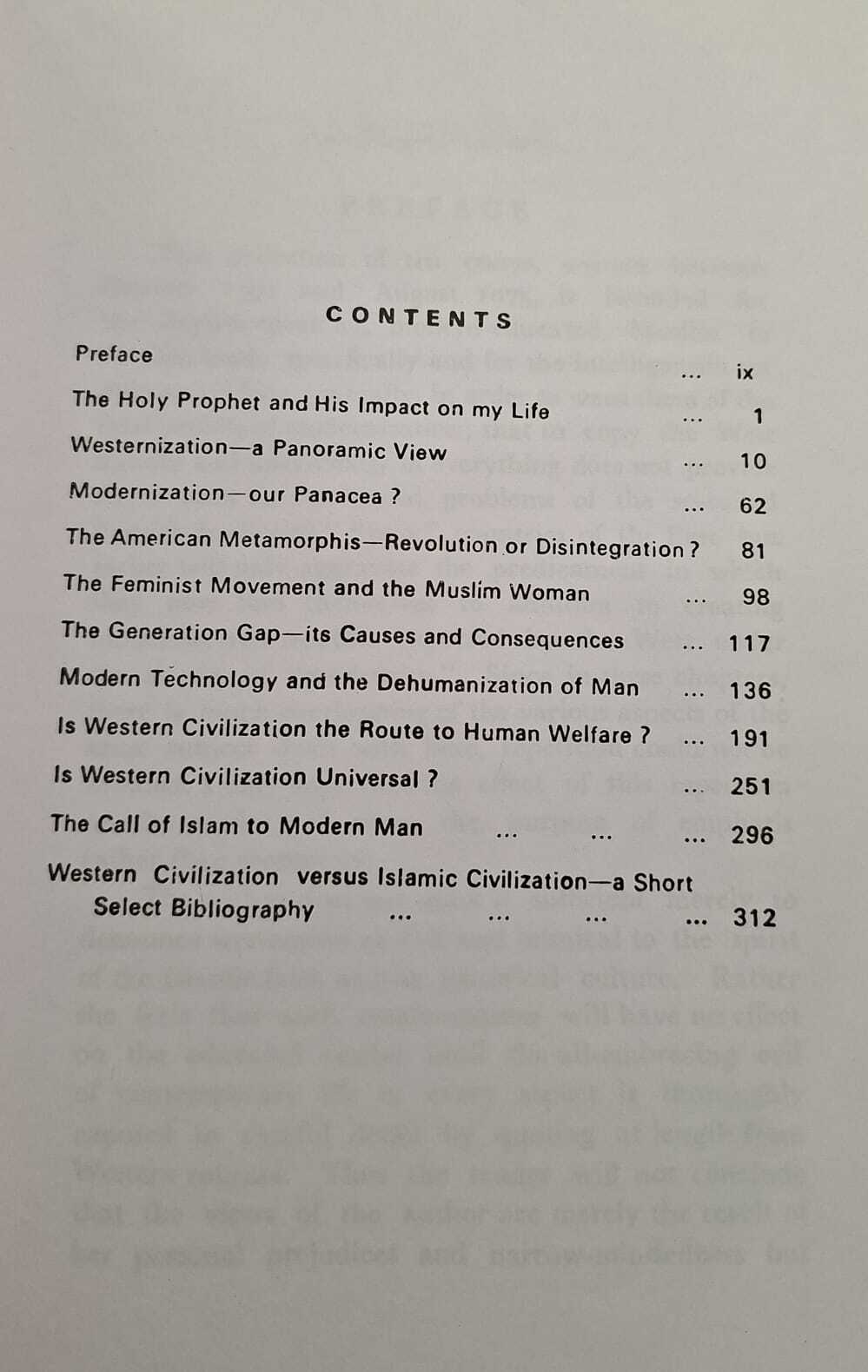 The book is a collection of ten essays, written especially for modern educated Muslims in which evils of Western way of life have been exposed. The external glamour of Western World is misleading and the readers are asked to follow the tenets of Islam.