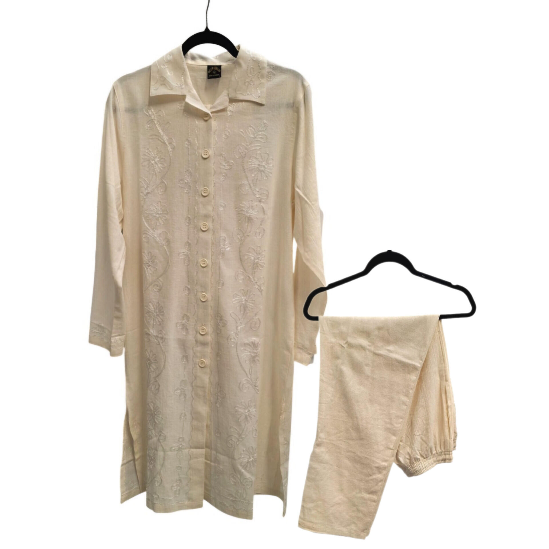 Sættet består af en lang tunika/kjole og matchende bukser i et let og åndbart materiale, der gør det behageligt at have på – også under længere dage i ibadah. Det enkle design er smukt fremhævet af fine, diskrete broderede detaljer, som giver sættet et eksklusivt og feminint udtryk uden at tage fokus fra formålet.