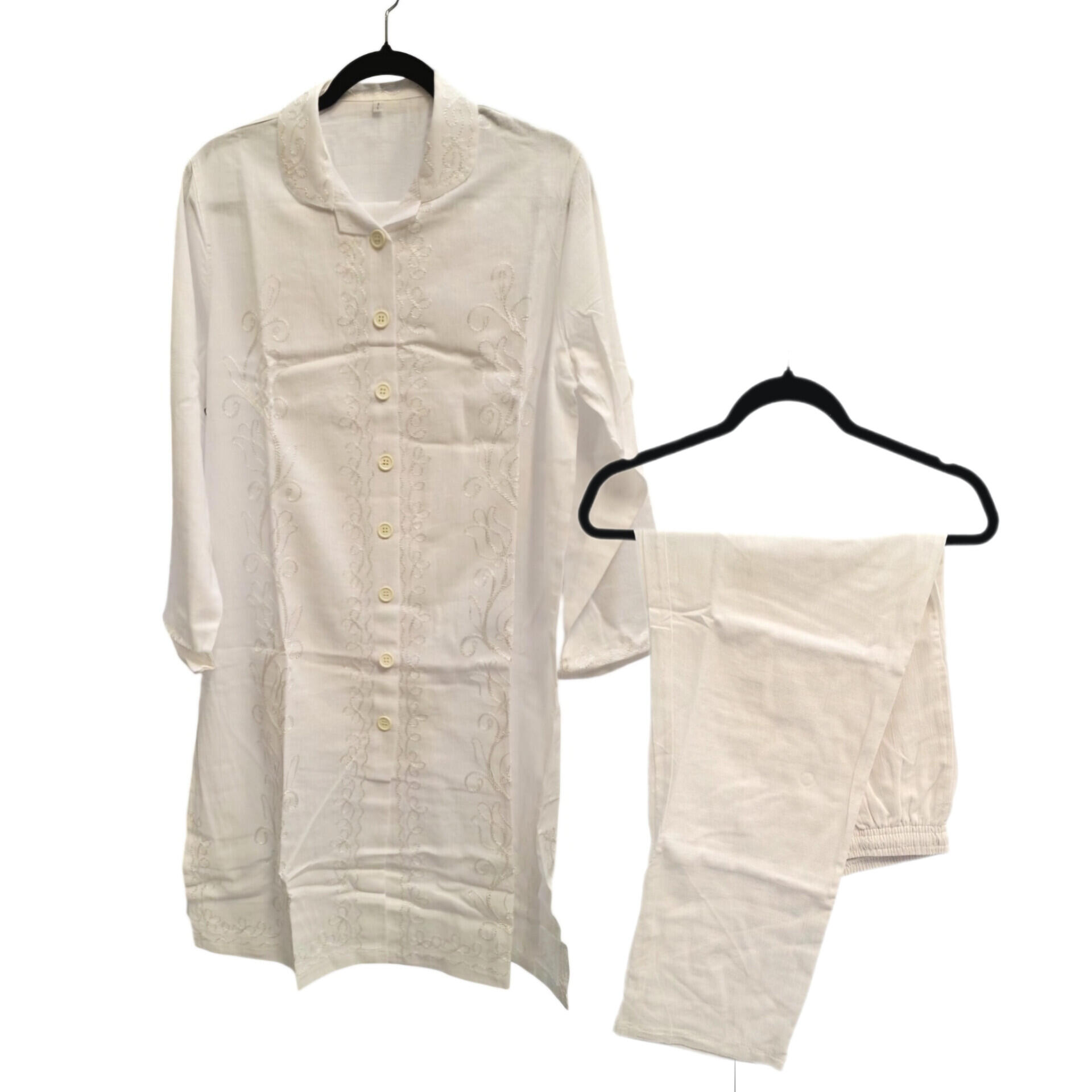 Sættet består af en lang tunika/kjole og matchende bukser i et let og åndbart materiale, der gør det behageligt at have på – også under længere dage i ibadah. Det enkle design er smukt fremhævet af fine, diskrete broderede detaljer, som giver sættet et eksklusivt og feminint udtryk uden at tage fokus fra formålet.