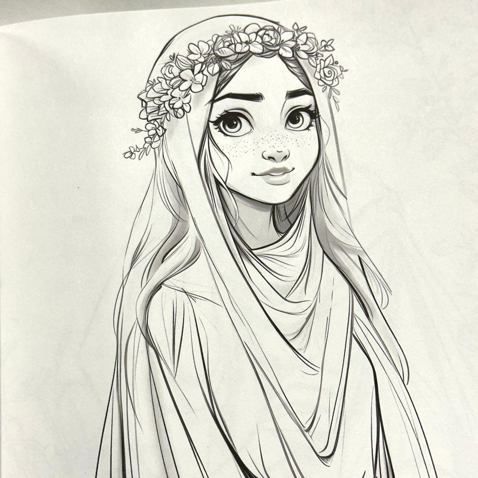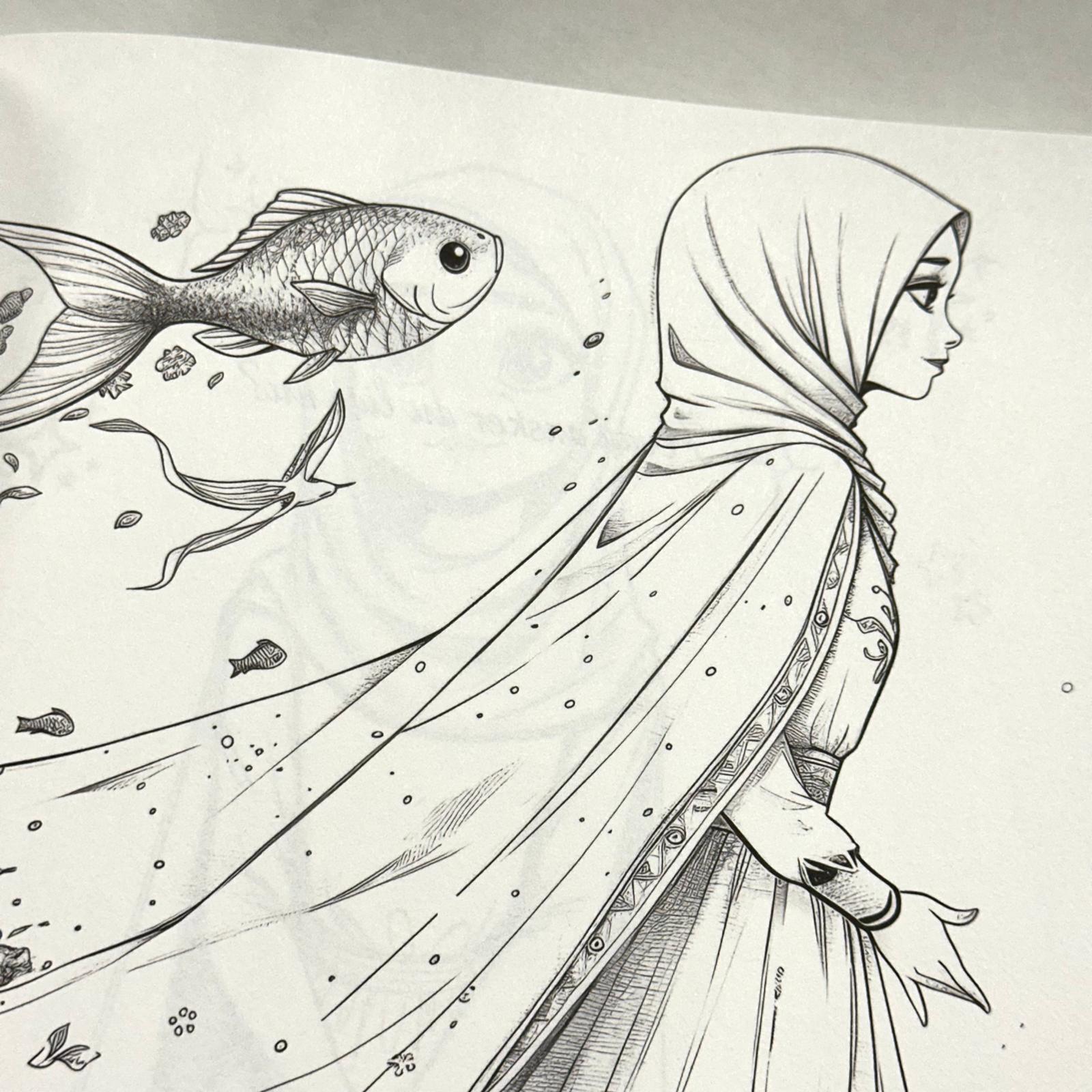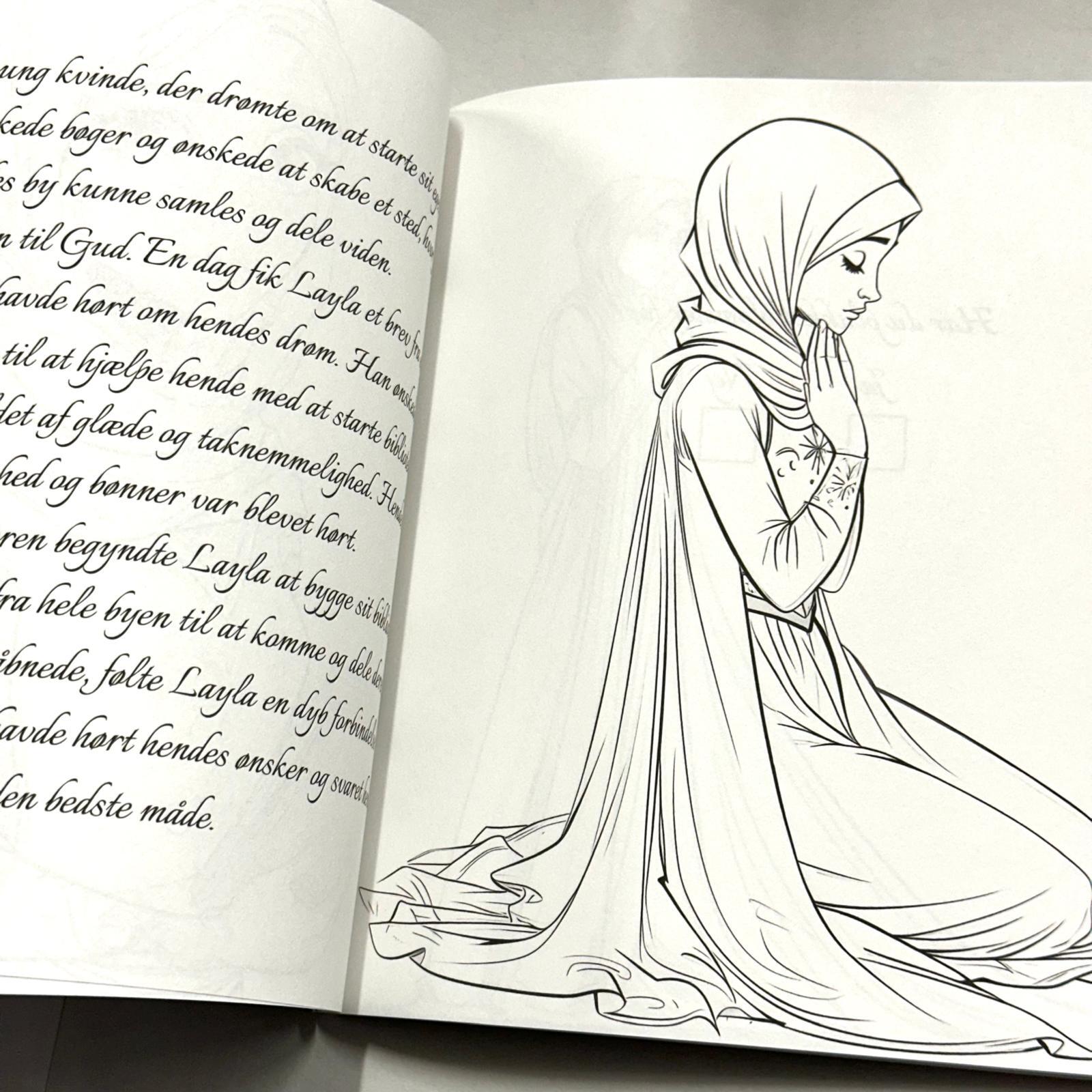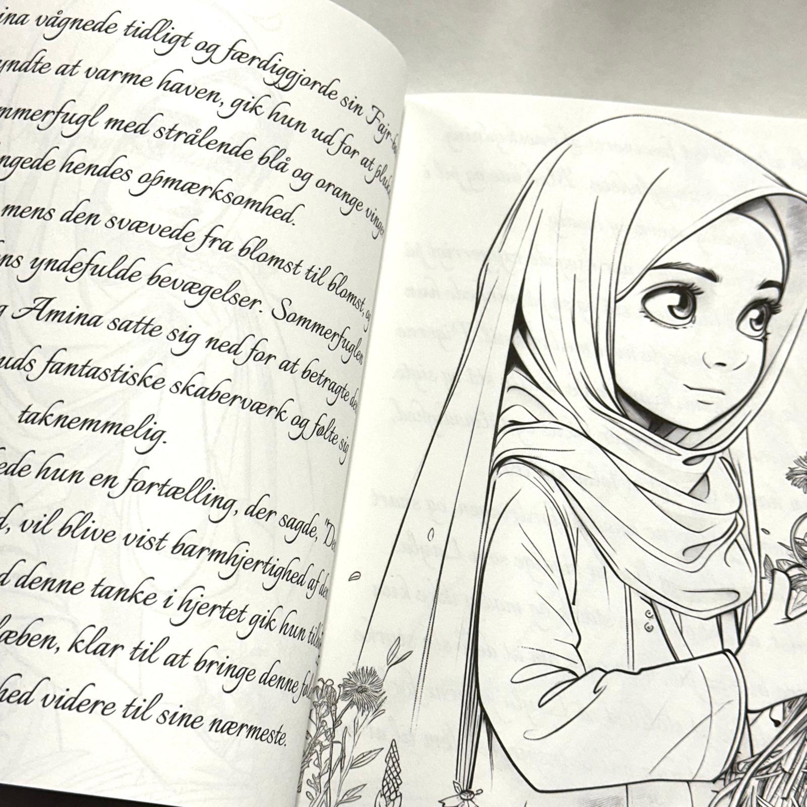 En inspirerende male- og tegnebog med hijabklædte prinsesser, eventyr og refleksionsspørgsmål – perfekt til kreative piger og kvinder i alle aldre.