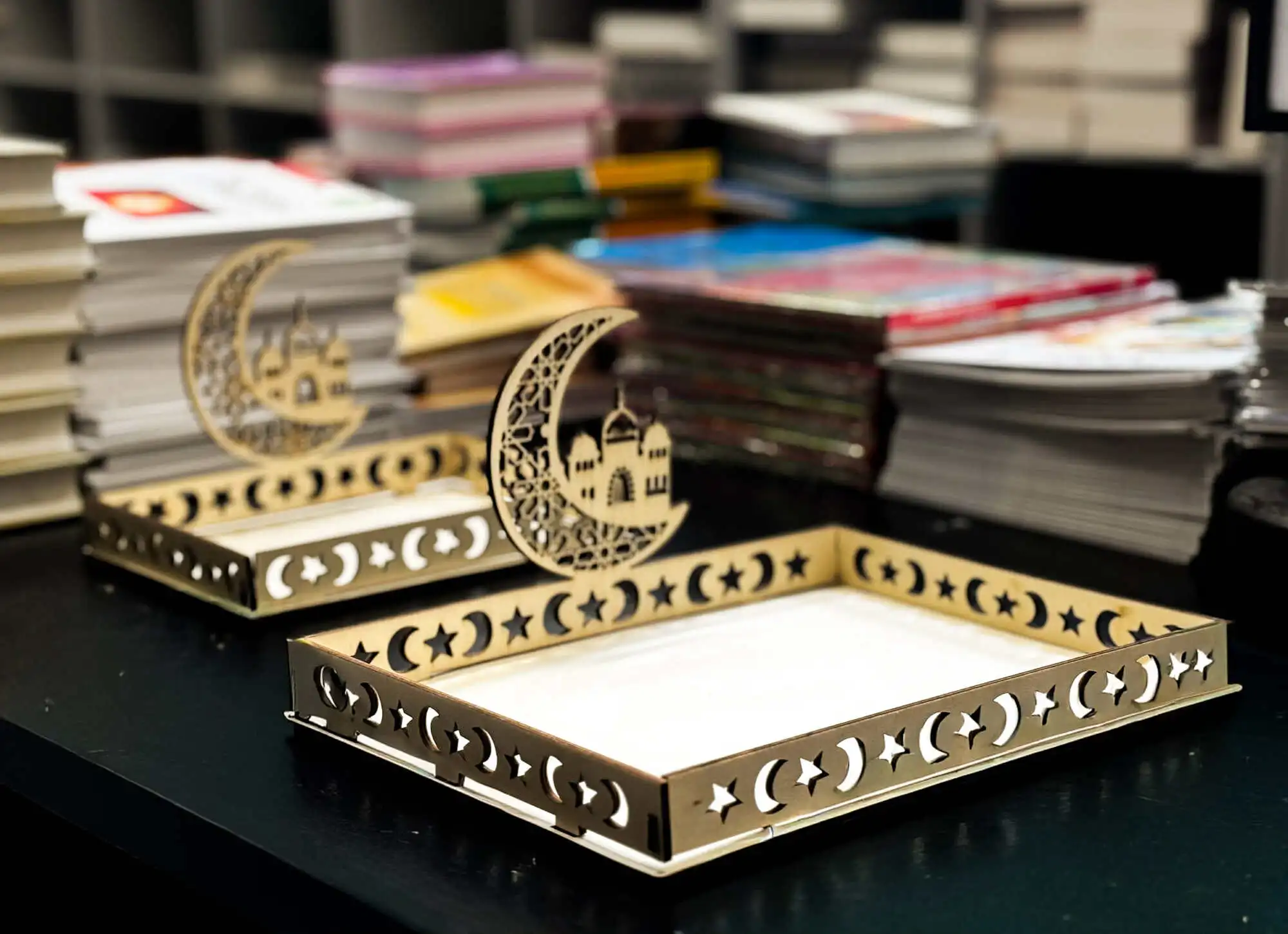 Elegante træbakker i 2 størrelser, perfekt til servering af snacks og drikkevarer til f.eks. Eid- og Ramadan-fejringer.