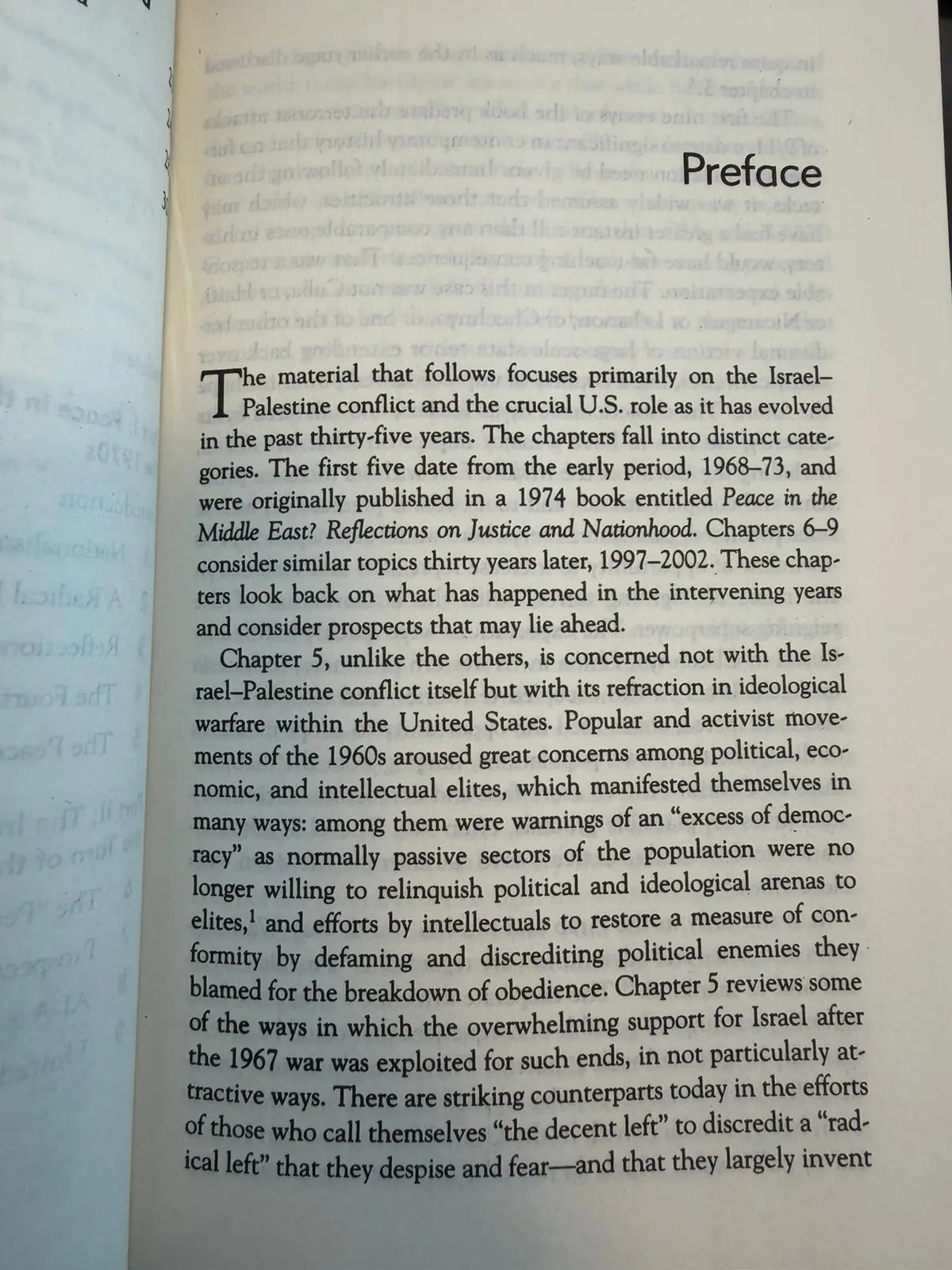 Just before the 2000 intifada and up through october 2002 as 9-11 and the us campaign against iraq have added new pressures to longstanding conflicts, chomskys voice should be heard now more than ever the book also includes the full text of chomskys earlier release, peace in the middle east?: reflections on justice and nationhood, written during the crucial period spanning the six-day and 1973 wars, which continue to define and deeply influence events today.
