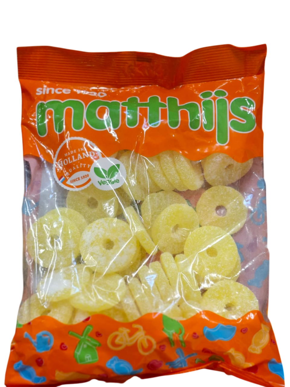 Ananasringe med en lækker tropisk ananassmag og en let syrlig overflade. 100% vegetarisk - gelatinefri.