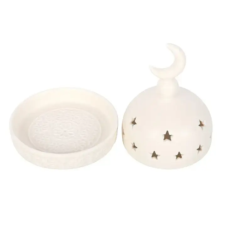 Denne elegante røgelsesholder er udført i lyst keramisk materiale og kombinerer funktionalitet med et roligt, dekorativt udtryk. Designet består af en rund skål til røgelseskegler eller -fyrfadslys samt et kuppelformet låg, der er udsmykket med små stjerneudskæringer. På toppen prydes låget af en halvmåne, som giver et stemningsfuldt og harmonisk udtryk.