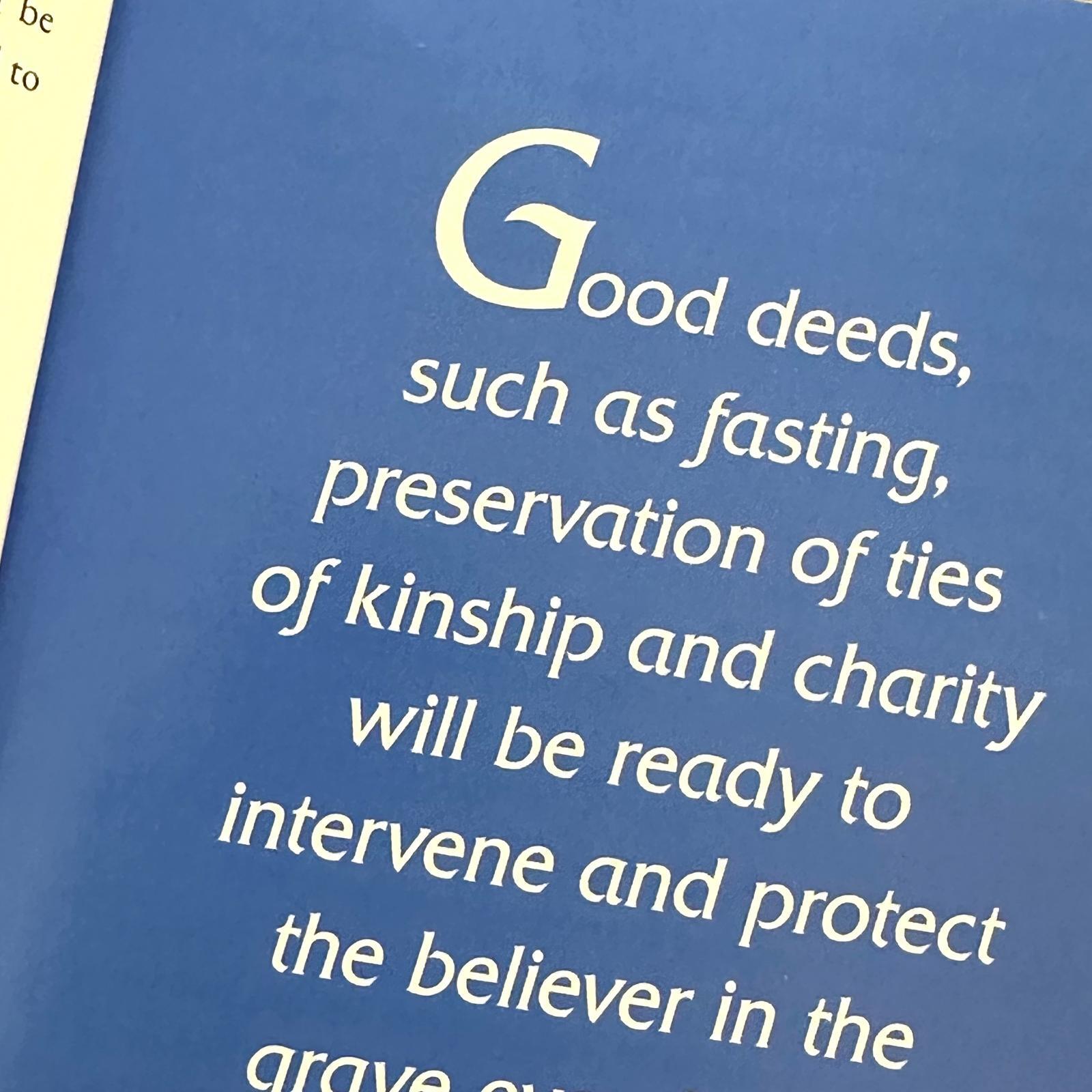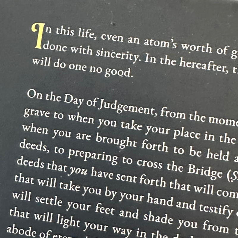 I hvert øjeblik af dommens dag, fra det øjeblik du rejser dig fra deres grav, til du indtager din plads i forsamlingen. Fra når du bliver bragt frem til at blive holdt ansvarlig af din Herre, til når du bliver ført til vægten for at skriftrullerne skal vejes, fra du forbereder dig på at krydse broen til din forventede ankomst ved paradisets porte. Der er gode gerninger, som du har udsendt, som vil komme dig til hjælp. Gerninger, der vil tage dig ved din hånd og vidne på dine vegne, som vil sætte dine fødder til ro og skygge for dig fra den brændende hede. Det vil lyse din vej i mørket og guide dig til den evige glædes bolig. Så spørg ikke din Herre, hvornår dommens dag vil være, men spørg dig selv, hvilke gerninger du har forberedt til den dag.