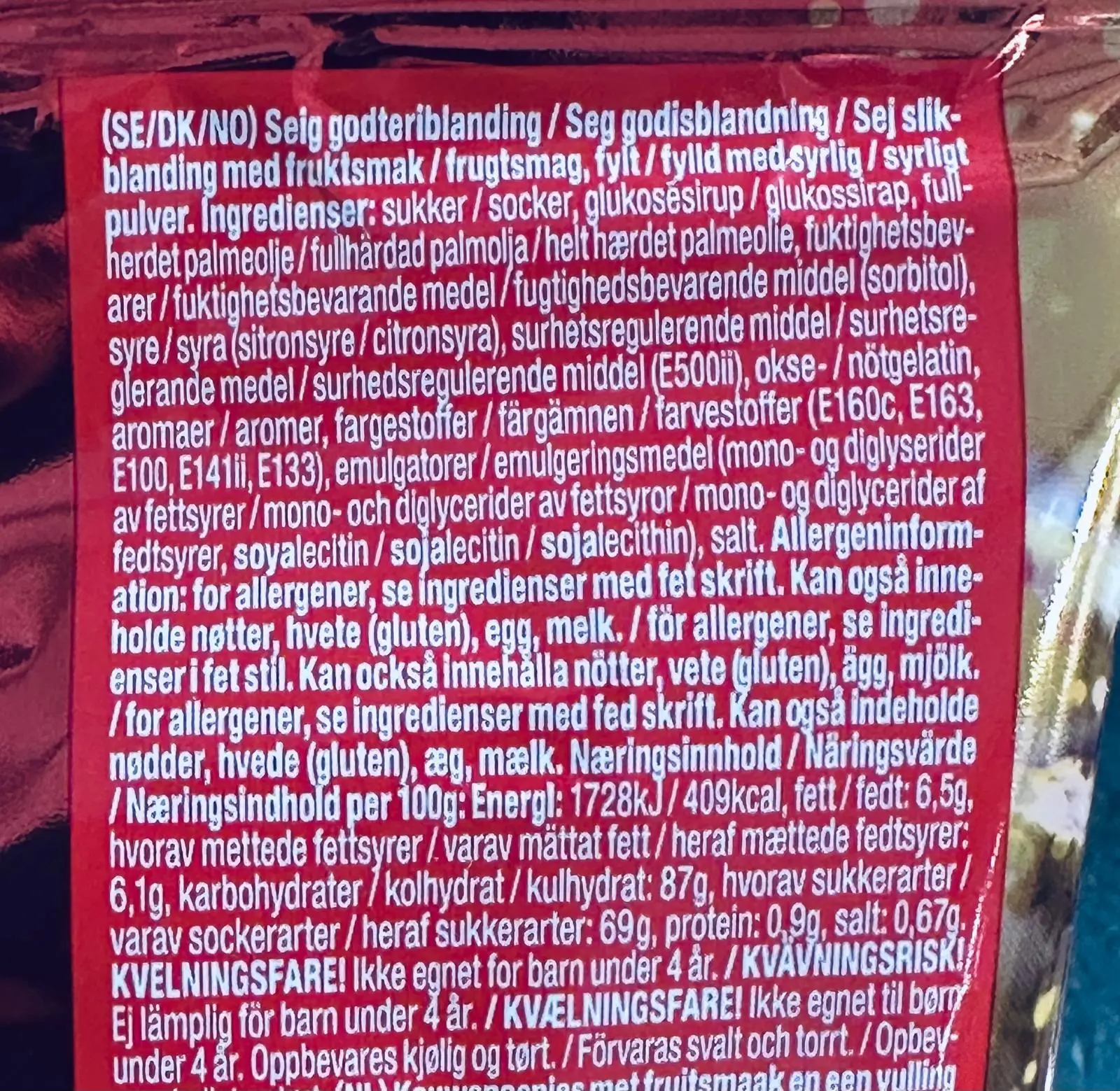 Sukker, glukosesirup, helt hærdet palmeolie, fugtighedsbevarende middel (sorbitol), syre (citronsyre), surhedsregulerende middel (E500ii), okse-/nøtgelatine, aromaer, farvestoffer (E160c, E163, E100, E141i, E133), emulgatorer (mono- og diglycerider af fedtsyrer, sojalecithin), salt.