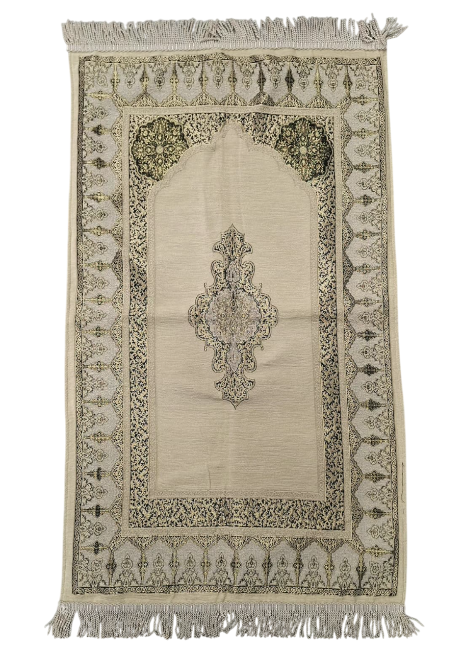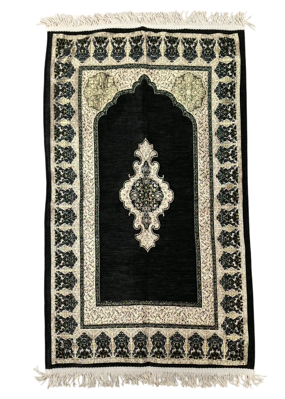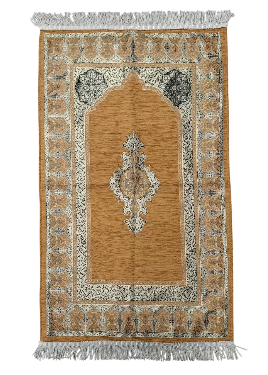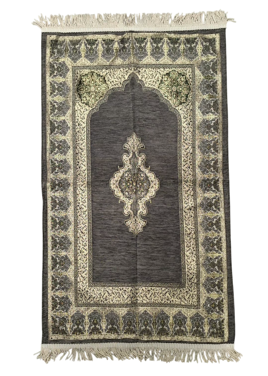 Den silkebløde overflade giver en behagelig og støttende fornemmelse under sujood, mens tæppets fine struktur og dybe farver udstråler værdighed, varme og åndelig balance. Hvert tæppe er designet med respekt for den islamiske tradition og bringer en følelse af fred og fokus til dine daglige bønner.