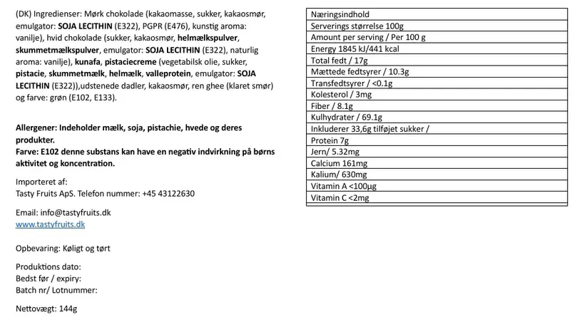 En eksklusiv delikatesse, hvor intens chokolade møder sprød kunafa og en cremet, rund pistaciecreme. Perfekt som gave – smagfuld, elegant og uforglemmelig. Dubai, dadler og eksklusiv delikatesse samlet under ét.