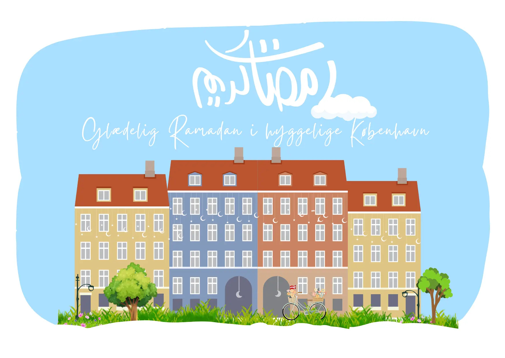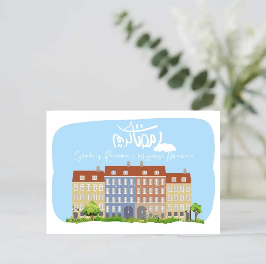 Dette kort indfanger den helt særlige ro og charme i Sydhavnen på en lys forårsdag. Illustrationen forener det lokale københavnerliv med Ramadanens budskab om nærvær og varme, fortalt gennem byens karakteristiske bygninger, grønne træer og den klassiske cykelkultur.